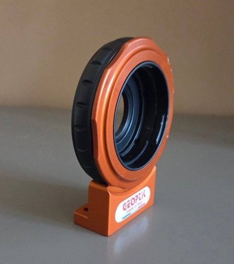In alluminio anodizzato e provvisto di basetta per fissare su slitte Losmandy o Vixen/GP e anche su treppiedi fotografici con passo del filetto 1/4″.