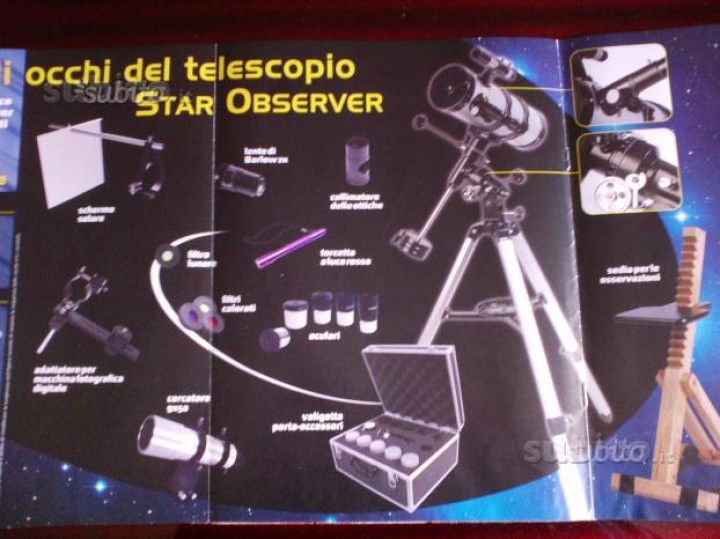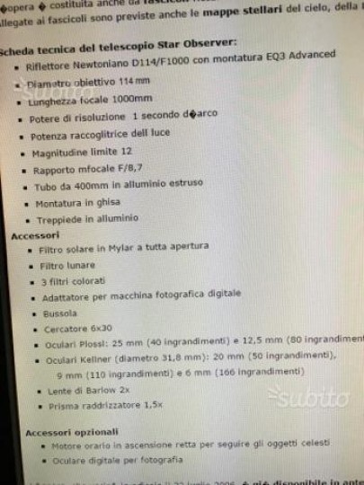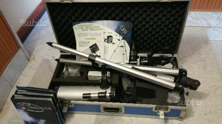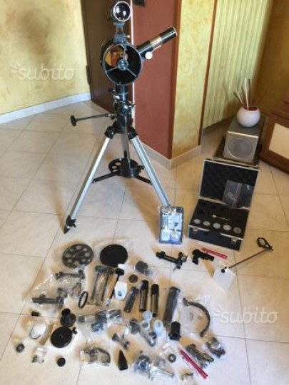 vendo telescopio usato pochissime volte completo di: n° 80 fascicoli con raccoglitori, atlante astronomico, diario astronomico, valigia robusta per trasporto telescopio, sacco per trasporto telescopio senza essere smontato, telo per coprire telescopio, valigetta per le lenti, sgabello in legno.