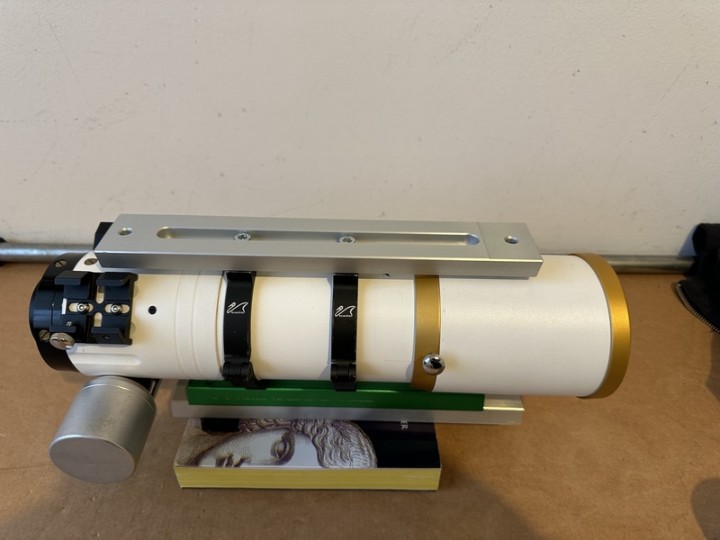 Vendo in blocco ottica, focheggiatore e se volete anche le tre barre che vedete in foto, in particolare le due sotto servono a metterlo su una montatura tipo EQ6-R e a posizionarlo bene senza che il focheggiatore originale o l'EAF ne impediscano lo scorrimento dentro alla slitta della montatura (per bilanciare in DEC). Inoltre, non trovo piu' la manopola di messa a fuoco originale che e' stata rimossa per montare l'EAF.