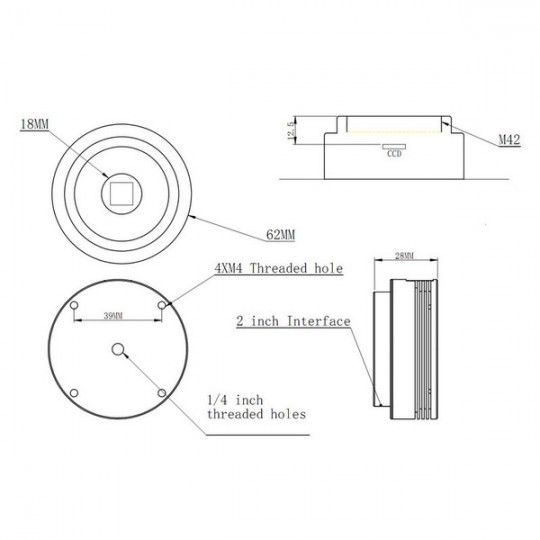 È possibile collegare la fotocamera al telescopio usando il filetto T-2. Include anche un obiettivo da 2,1 mm che può essere avvitato direttamente al corpo della fotocamera. Dotata di cavetto usb.