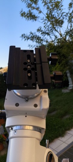 Presente vite in acciaio e maniglia a ripresa per la regolazione in altezza e morsetto doppio Vixen/Losmandy costruito da noto artigiano presente su astrosell.