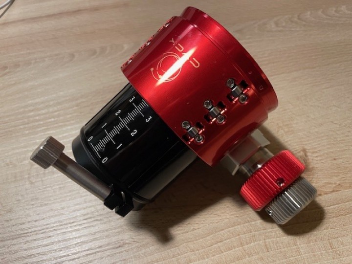 Focheggiatore ben fatto, robusto, con demoltiplica. Altezza dalla flangia solo 4cm, corsa di 6 cm su solidi cuscinetti che ne garantiscono la rigidità e linearità. Scorrimento su guida filettata, pertanto molto meglio degli originali skywatcher che potevano anche "scivolare" se troppo carichi.