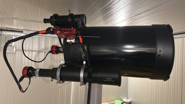 Telescopio come nuovo. Comprende anche la fascia anticondensa montata sullo specchio anteriore. Compreso barra Losmandy e 2 culatte M48 e M54 fatte da un artigiano al tornio. Riduttore di focale F6,3.
