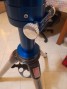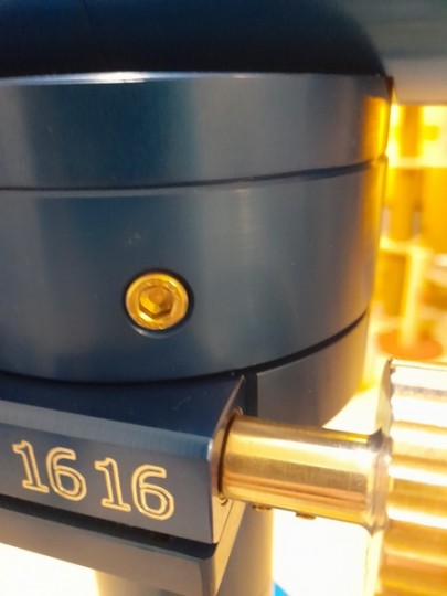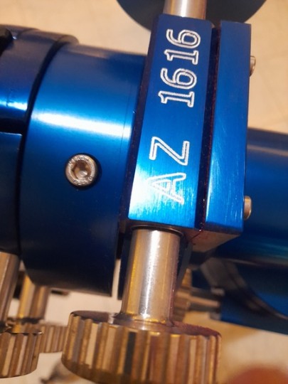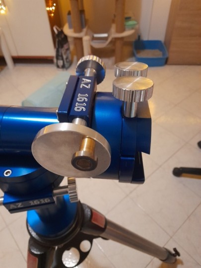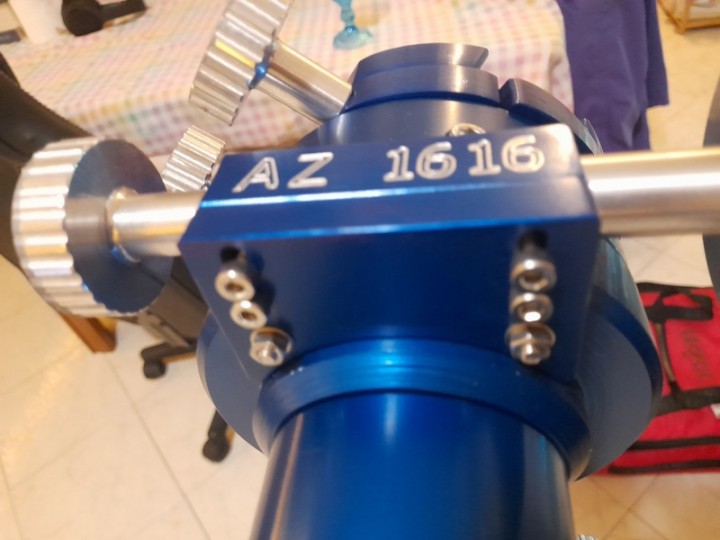 Unica "stranezza", forse frutto di un malinteso: il morsetto secondario ruota solidale a quello principale solo se si aziona il micrometrico di altezza. Se si spinge l'ottica su morsetto principale, quella sul morsetto secondario rimane fissa rispetto al movimento alto-basso. Sembra un progetto di equatoriale adattato in altazimutale invece di uno realizzato ad hoc.. Dopo una grattata di capo iniziale ho chiesto a Michele di di realizzarmi una ruota per il comando di altezza dotata di pomello su cuscinetto a sfere per agevolare, pur con il micrometrico, quegli spostamenti ampi in altezza che normalmente si eseguono semplicemente brandeggiando il tubo. Dopo un iniziale disorientamento ci ho fatto presto l'abitudine e rimane intatto il valore di una montatura realizzata come si deve.