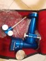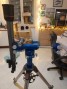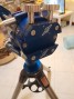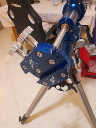La testa pesa circa 10 kg e sorregge due tubi ottici fino a circa 16 kg per parte grazie a due morsetti vixen con lardone e coppia di pomelli ciascuno. Splendidamente realizzata in acciaio e alluminio con anodizzazione blu elettrico, ha movimenti micrometrici in entrambi gli assi e frizioni regolabili con brugola. A frizioni completamente aperte il telescopio si sposta in ambo gli assi con una leggera pressione del dito, e i micrometrici sono pastosi e uniformi. Realizzata da Michele su mia ordinazione, ha richiesto un'attesa di circa 9 mesi per un costo di quasi 900 € solo testa, niente a che vedere con la produzione cinese per quanto funzionale sia.