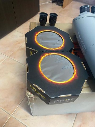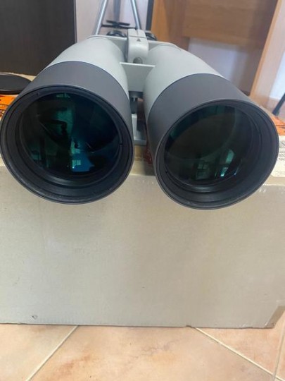 Vendo stupendo binocolo astronomico APM 100 mm 45° Semi-Apo con coppia di oculari SWA 20mm 70°, coppia di filtri lunari 31.8, coppia di filtri gialli 31.8 e filtro solare binoculare a tutta apertura Suncatcher Explore Scientific per visioni solari color veramente spettacolari. Completo di scatola imbottita originale. Il tutto pari al nuovo.