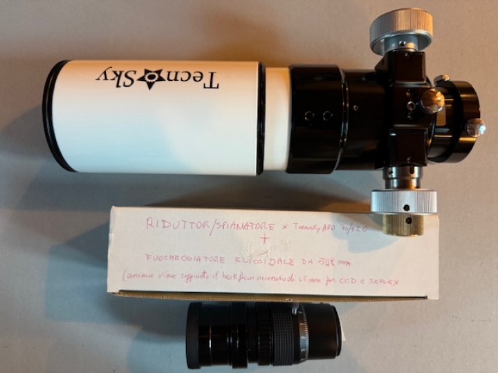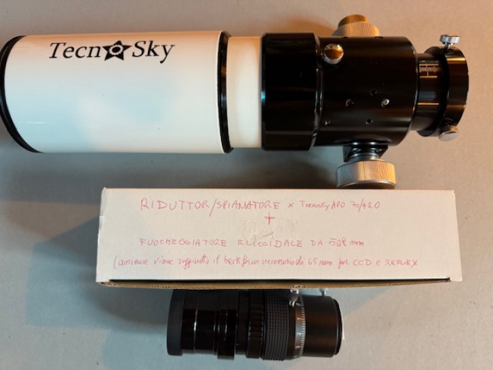 Vendo rifrattore APO Tecnosky 70/420, f/6, completo di riduttore/spianatore di campo con fuocheggiatore elicoidale da 508 mmm. Questa combinazione permette di raggiungere il backfocus necessario di 65 mm per CCD. più spese di spedizione.