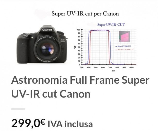 Canon 6d solo 6500 scatti praticamente nuova. Garantita da Canon fino a 150.000 scatti. Modificata uv/ir (per gli addetti ai lavori è la migliore modifica per astrofotografia). Condizioni eccellenti pari al nuovo. Dotazione accessori : caricabatteria originale Canon, batteria originale Canon, falsa batteria e alimentatore per lunghissime pose, temporizzatore, scheda di memoria 32 giga, anello adattatore canon, cinta originale canon. Sensore integro e pulito! Pixel grandi (6,54 micron) a vantaggio della capacità di saturazione, 20,2 megapixel, sensore 24mm x 36mm, efficienza quantica 50%, iso consigliati 1600/3200, basso rumore come si evince da grafico in foto che mette a paragone canon 6d (grafico azzurro) e canon 6d markII (grafico nero). Guadagno poco più di 1 stop in termini di rumore in confronto alla canon 6d mark II. Tra le migliori reflex fullframe deepsky! Solo la modifica è costata 299 euro!!