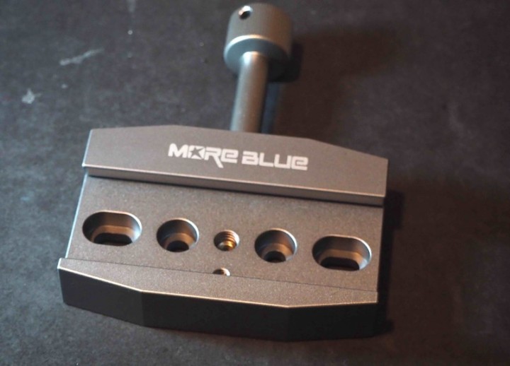 Morsetto di alta qualità della More Blue, lunghezza 11cm, foro centrale filettato 3/8'', con boccola di riduzione in acciaio per portare la filettatura a 1/4'', due fori laterali non filettati asolati M6. Indistinguibile dal nuovo.