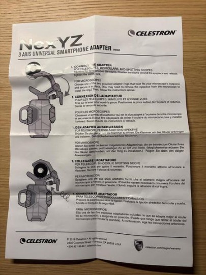 Vendo per inutilizzo adattatore Celestron NexYZ per utilizzare la fotocamera del cellulare con un telescopio, all'oculare o al fuoco diretto.