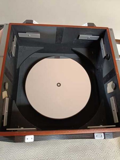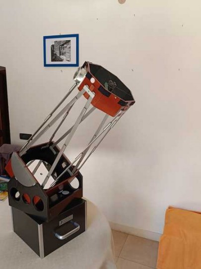 Il coperchio della valigetta fa da base x il movimento in azimuth,. Struttura molto solida , disegnata per estrema portatilità e compattezza, tutta in legno , non ci sono flessioni. Tiene bene la collimazione ed i movimenti sono fluidi senza scatti.