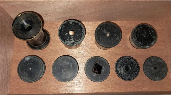 Gli oculari e gli accessori vengono forniti in una scatola in legno anche essa d'epoca (anche se proveniente da altri usi...).