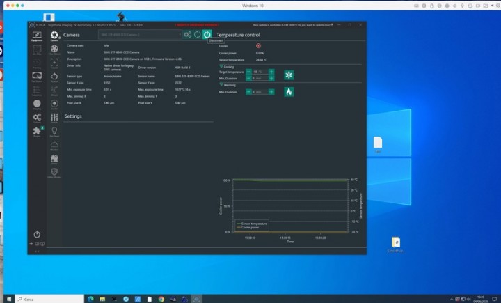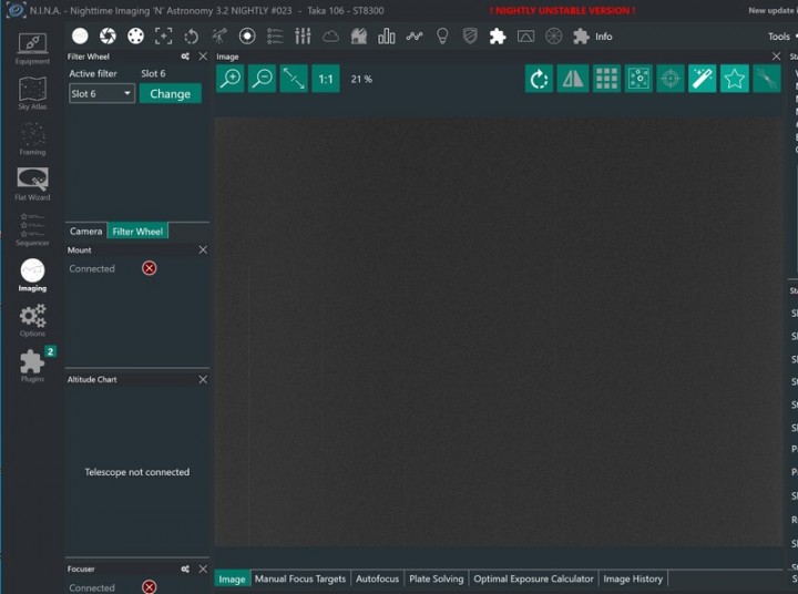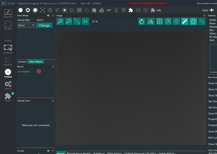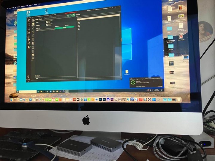 La camera ST8300 può essere usata tranquillamente con NINA e altri software di controllo tramite driver di terze parti (in caso posso fornirli). Nelle immagini è possibile vedere la camera e la ruota collegate a NINA (addirittura al Mac in modalità Windows...).