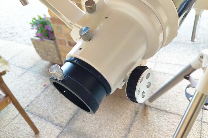 Privo del riduttore a 1.25" e del relativo tappo, presente quello dell'obiettivo. Normali segni d'uso sulla coda di rondine. Oggi (e solo oggi!) nel fotografarlo ho notato dei graffietti sull'obiettivo, che ho cercato di riprodurre in foto, così tanto per correttezza, ovviamente del tutto ininfluenti con qualsiasi oculare, né su terrestre e né su cielo notturno. Per il resto è perfetto e pure ben collimato (testato col REEGO). Alla bisogna, la cella è collimabile.