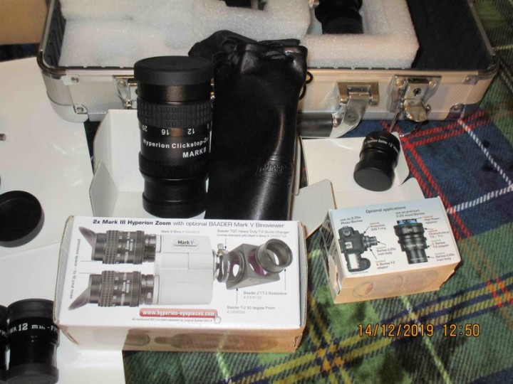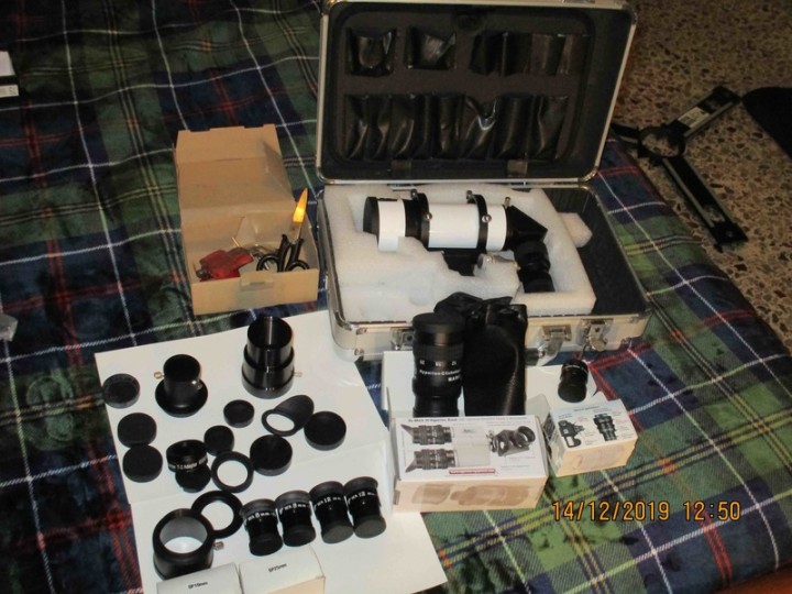 Nella dotazione del telescopio metto diversi oculari e prolunghe di varia misura, anelli e adattatori con la valigetta, piu un'altra valigetta per pulsantiera e cavi e chiavi varie. Prezzo € 1235