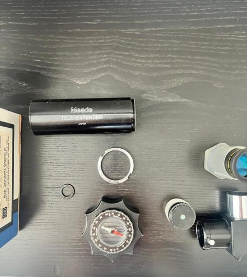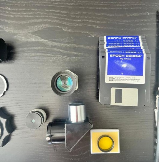 Ci sono diversi accessori tra cui la testa equatoriale originale, 1 filtro colorato, 2 oculari, prisma, accessori per collegare una macchina fotografica, il software per la gestione in remoto (con laptop che necessita di uno schermo esterno), un trasformatore con presa per accendisigari mai usato. Manuali di uso originali.
