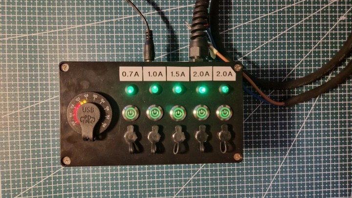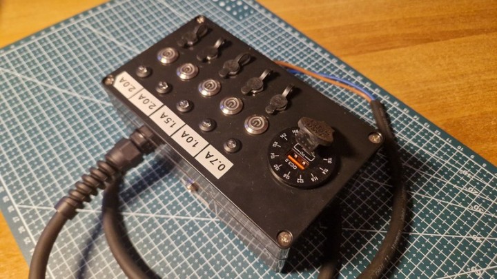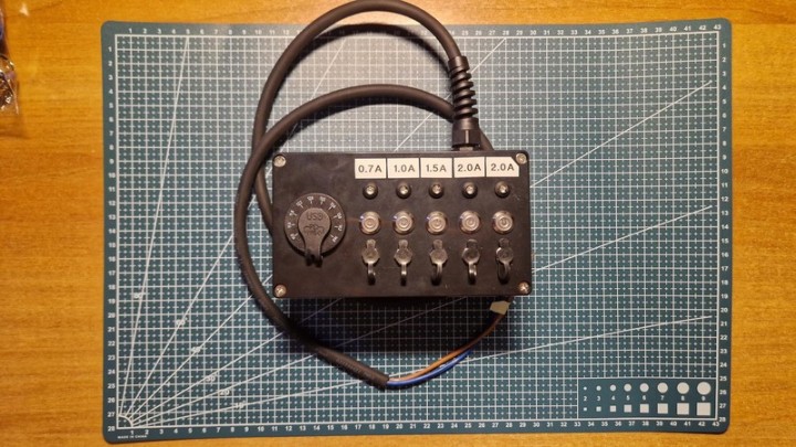 Complesso elettronico di protezione alimentazioni a 12V. Sono disponibili 5 canali di alimentazione e per ciascuno è possibile tarare una soglia di corrente massima da 0.6A a 6A.