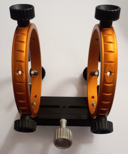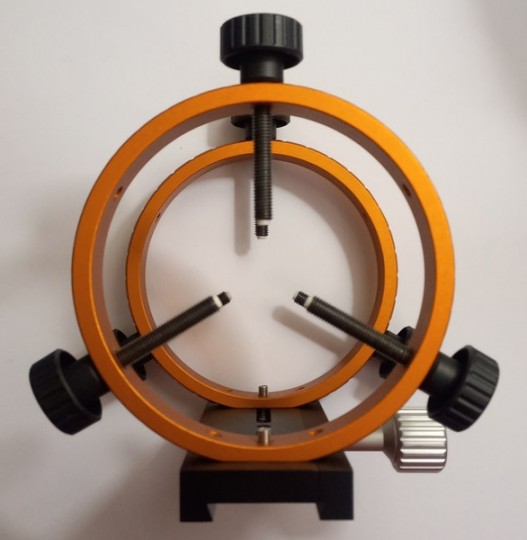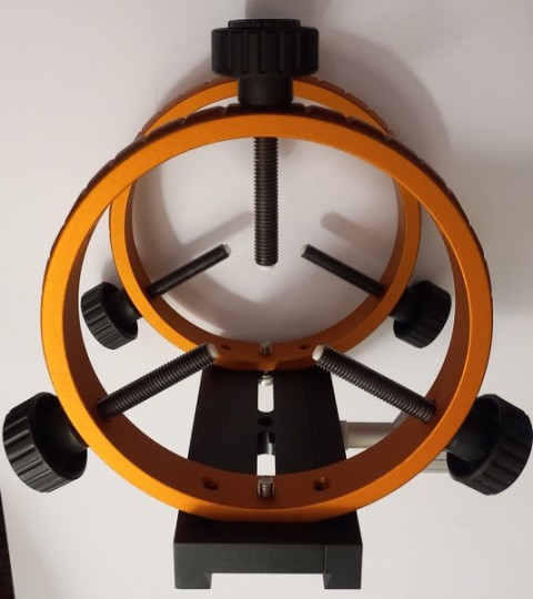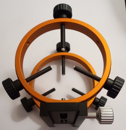 Struttura solidissima, diametro interno anelli 130mm. Può decentrare tubi da 70mm a 120mm prendendo come riferimento il diametro del tuboguida! Peso 944 gr. Il lardone assicura una presa solidissima perchè la pressione è distribuita su tutta la staffa lunga 150mm. Le temute flessioni differenziali che possono rovinare l'autoguida, non sono presenti! Stato del bene eccellente!