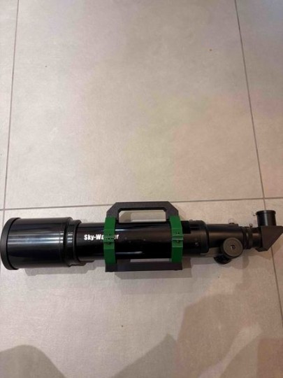Skywatcher 70/500 con diagonale e anelli stampati da me in 3d (materiale PETG). Anche la barra e la maniglia sono stampati e non in alluminio. Se usati con un morsetto reggono benissimo il peso.