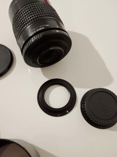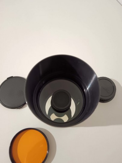 Nella vendita sono inclusi un paraluce a vite, un filtro arancione a tutta apertura, e un anello adattatore da M42 a Canon EOS per montare l'obiettivo su corpi reflex Canon.
