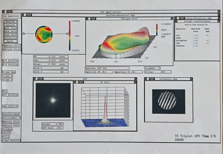 Si tratta di uno strumento, commercializzato dalla tedesca Teleskop Service (TS), la cui costruzione è assai curata, sia dal punto meccanico che ottico, oltre ad essere esteticamente molto gradevole. Il tripletto apocromatico, il cui elemento centrale è in vetro FPL55 , è alloggiato in una cella regolabile. Il focheggiatore di 2” è in grado sostenere pesi fino a 6Kg e può ruotare di 360°. Ogni esemplare del CF-APO 70mm è identificato da un numero di serie ed è accompagnato un “test Certificate” (vedi foto allegate).