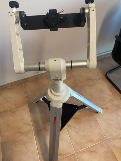 Montatura altazimutale a forcella Vixen HF2 completa di piastra di montaggio binocolo, morsetto Vixen e treppiede in alluminio Vixen SXG-HAL 130 con vano porta oggetti. Usata in modo impeccabile con binocolo astronomico APM100.
