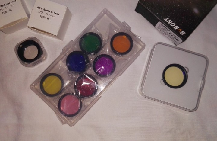 Vari accessori : due oculari 31.8mm svbony asferici WA 65° 16mm in uno manca il paraluce , diagonale a specchio 31,8mm , oculare 2" svbony asferico SWA 34mm 72° , diagonale a specchio 2" con riduttore da 31,8mm , filtri colorati 31,8mm , filtro svbony color correction 31,8mm utile per ridurre il cromatismo e aumentare il contrasto nei rifrattori acromatici , riduttori di focale 0,5x 31,8mm , raccordo 31,8mm a 2" , raccordo maschio 48mm a SCT femmina , raccordo m42 a 48mm , raccordo 31,8mm a m42 , focheggiatore elicoidale m39 a m42 ,. materiale praticamente nuovo.