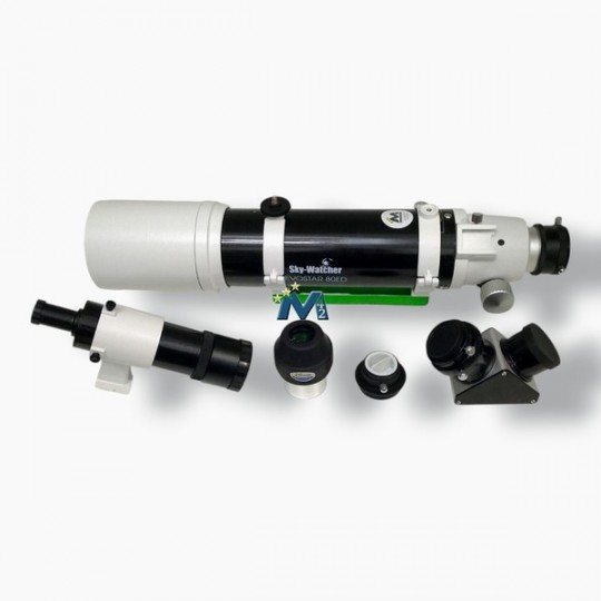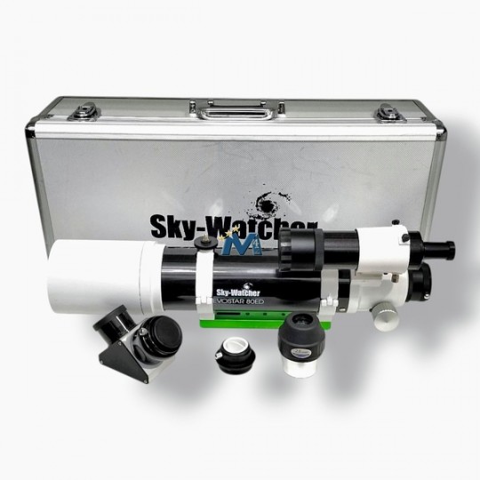 Rifrattore Sky-Watcher Evostar 80ED (D80mm/F600mm f/7.5) completo di oculare LET 28mm 2"; diagonale 2" dielettrico 90°; cercatore 8x50; focheggiatore Crayford Dual-Speed da 50,8mm con riduttore 31,8mm; anelli e barra a coda di rondine; valigia rigida.