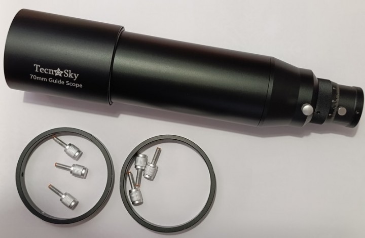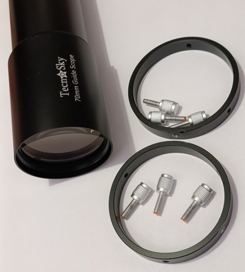 La dotazione comprende una coppia di anelli disassabili. Sul tubo sono inoltre presenti 2 fori filettati per poter avvitare direttamente una barra vixen ed avere un supporto più solido sia come telescopio guida (non disassabile) che come telescopio da viaggio.