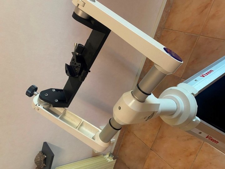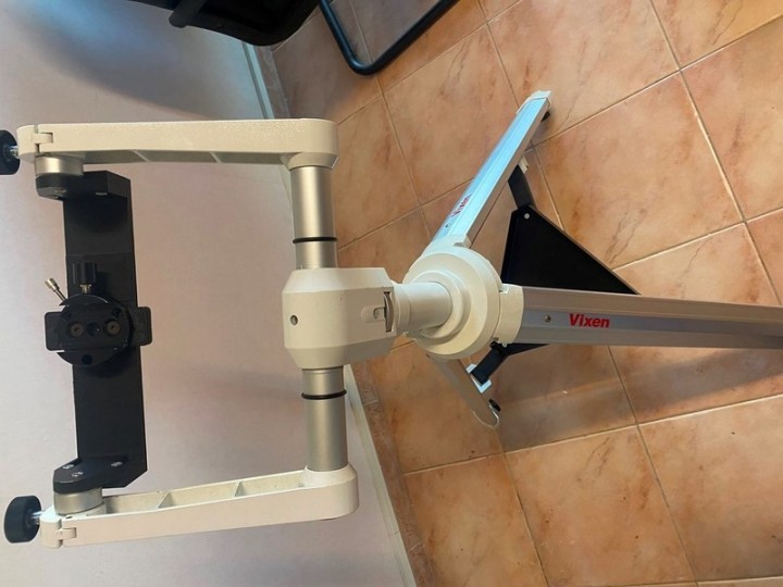 Montatura altazimutale a forcella Vixen HF2 completa di piastra di montaggio binocolo, morsetto Vixen e treppiede in alluminio Vixen SXG-HAL 130 con vano porta oggetti. Usata in modo impeccabile con binocolo astronomico APM100.