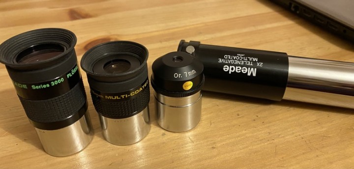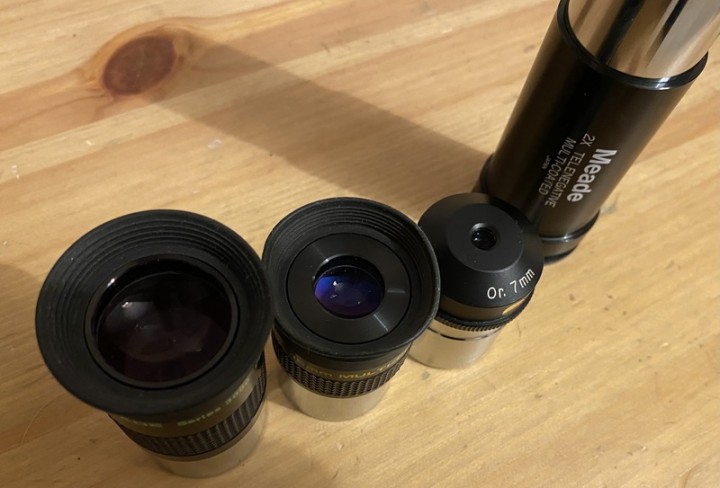 Vendo solo in blocco set composto da Meade Plossl serie 3000 25mm, Meade super plossl 15mm serie 4000, Ortho Japan optik 7mm e Barlow 2x apo Meade tutto made in Japan. Condizioni pari al nuovo. Solo in blocco cedo il set a 150 euro spedito. Non separo il materiale.