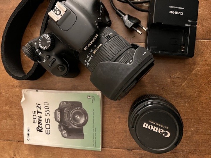 Vendo reflex digitale Canon EOS550D non modificata con obiettivo EFS 18-55mm, zoom Sigma 17-70mm, batteria originale, carica batteria. Unico proprietario. Segnalo che il tappo dello zoom Sigma non ha una delle due molle di aggancio. € 100 + ss.