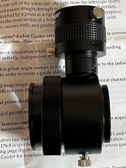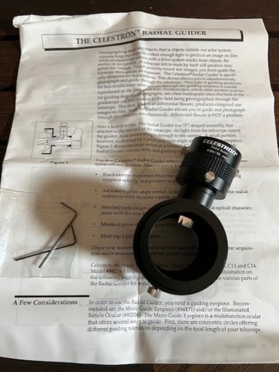 Vendo guida fuori asse Celestron (Radial Guider). Lato camera la guida di avvita al raccordo T2 di una camera digitale. Lato telescopio si aggancia alla culatta della Schmidt Cassegrain. €50 + ss.