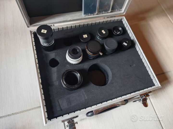 In aggiunta alla dotazione standard è presente l'alimentatore per le sessioni notturne, l'adattatore per oculari più grande, e una serie di oculari: