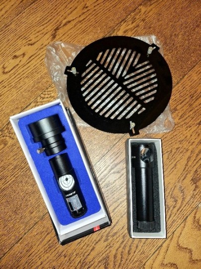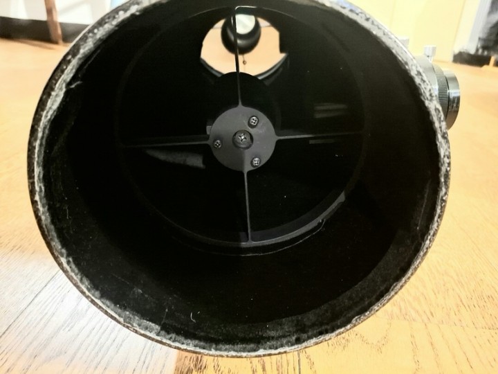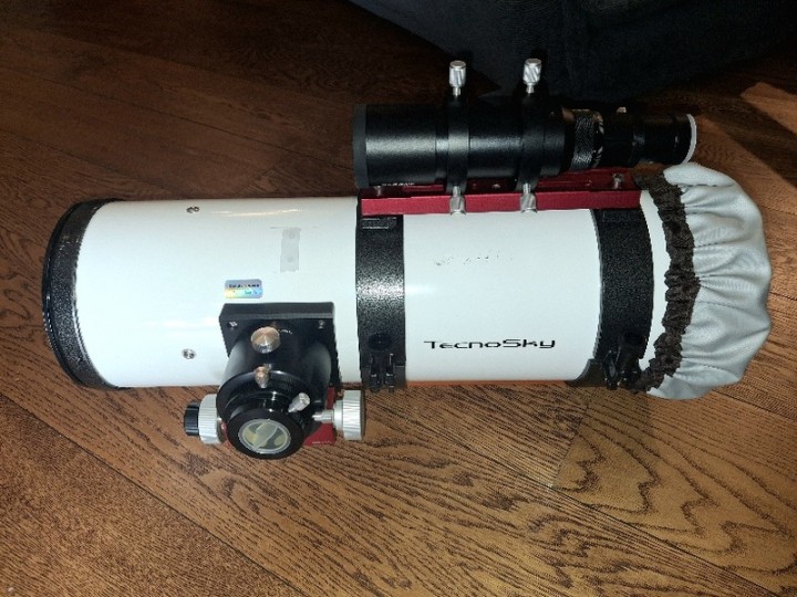 E' ottimizzato per astrofoto e completo di tutto: il tubo internamente è stato rivestito di vellutino nero e il contrasto ne ha beneficiato moltissimo, è stato sostituito il supporto del secondario con un supporto di Backyard Universe in alluminio pieno lavorato cnc (sito Backyard Universe per maggiori info) collimazione molto più precisa e decisamente più stabile.