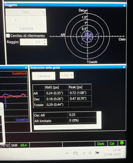 Per passaggio a montatura a moto armonico e quindi per non più utilizzo vendo testa montatura Skywatcher HEQ5pro con pulsantiera Synscan, contrappeso da 5kg e doppio morsetto Vixen/Losmady fatto costruire di miglior qualità (fornisco anche l’originale). A dicembre ho fatto eseguire un tuning completo presso La Torre del Sole da Davide Dal Prato che l’ha resa letteralmente perfetta! Il tappo copri cannocchiale polare presenta una piccola crepa che ho risolto con nastro americano ripristinando il filetto e che paradossalmente ne aumenta il grip eliminando il famoso “problema” dell’avvitamento. Per il resto parliamo di una montatura tra le più riuscite in questa fascia. Il grafico di PHD si riferisce ad un sistema di guida composto da 70ED (420mm) e ASI290mm (2.9um). 500€ (spedizione a carico dell’acquirente).