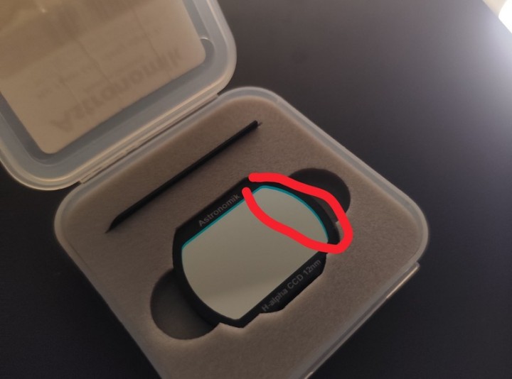 Vendo questo Astronomik per passaggio al 6nm ad un prezzo così basso per un graffio su un lato del filtro. ( si vede in controluce in una foto ho segnato). 180 euro escluse spese spedizione