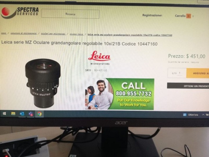 Per conto di un amico, vendesi bellissimo OCULARE LEICA 10X (da microscopio)... qualità ai massimi livelli... prezzo del nuovo negli Stati Uniti era di ben 451 dollari! (come si evince da una delle foto del sito SPECTRA SERVICES), anche se ora è salito a ben 572 dollari!!! (al cambio di oggi circa 500 euro, spedizione esclusa)... viene fornito anche del suo contenitore originale... L'OGGETTO E' NUOVO, IN QUANTO RIMANENZA DI MAGAZZINO!!! Barilotto da 30mm. e focale equivalente 25mm. (x eventuale uso astronomico)... richiesti SOLO 180 euro (NON TRATTABILI, VISTO CHE E' NUOVO E COSTA QUASI 500 EURO)... specifiche tecniche: oculare 10x/21B, regolabile, ad ampio campo per portatori di occhiali, senza distorsioni, con conchiglia oculare, progettato per l'utilizzo di reticoli