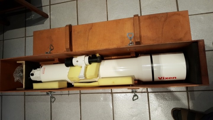 Rifrattore VIXEN NA140 SS, obiettivo diam. mm. 140, focale mm.800; f 5,7, completo di cercatore 9 X 50; flip mirror; anelli e barra a coda di rondine; tappo originale; cassa in legno con alloggiamento tubo e accessori per trasporto e stoccaggio. Leggeri graffi d'uso sul tubo. Strumento composto da quattro lenti in due gruppi che producono un campo completamente spianato ed una sensibile riduzione dei cromatismi. Eccellente in visuale e ottimo anche in fotografia.
