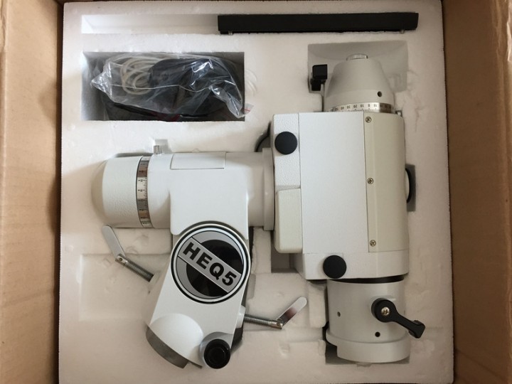 Tutti gli accessori originali presenti, dal cannocchiale polare al cavo con presa accendisigari, dal vassoio porta oculari in metallo al treppiede regolabile, ai due contrappesi da 5 KG (in foto con il Newton montato si vede solo uno dei due.